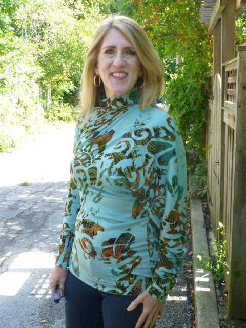 Itt van ez a blúz. Kivételesen az anyaga is tetszik, különleges a mintája. Teljesen elasztikus, nyúlik keresztbe-kasul. Bár ez az itt megtekert-ott ráncolt fazon szerintem jobban mutatna egyszínű anyagból, de kinek mi tetszik ugyebár...