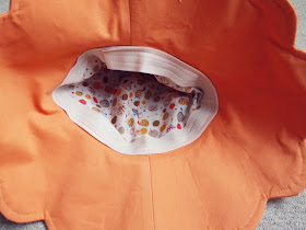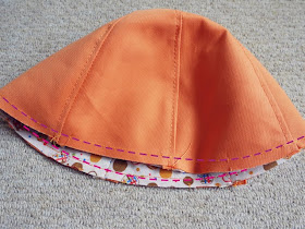 Színt színnel szemben összetűzzük a kalap külső és belső részét, a varrásszélt becsipkedjük, kifordítjuk a kalapot, bevarrjuk a lyukat, letűzzük a karimát.